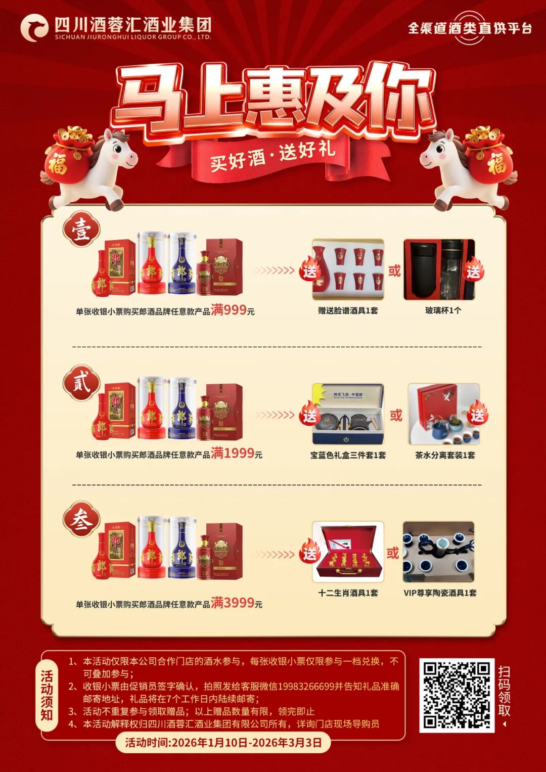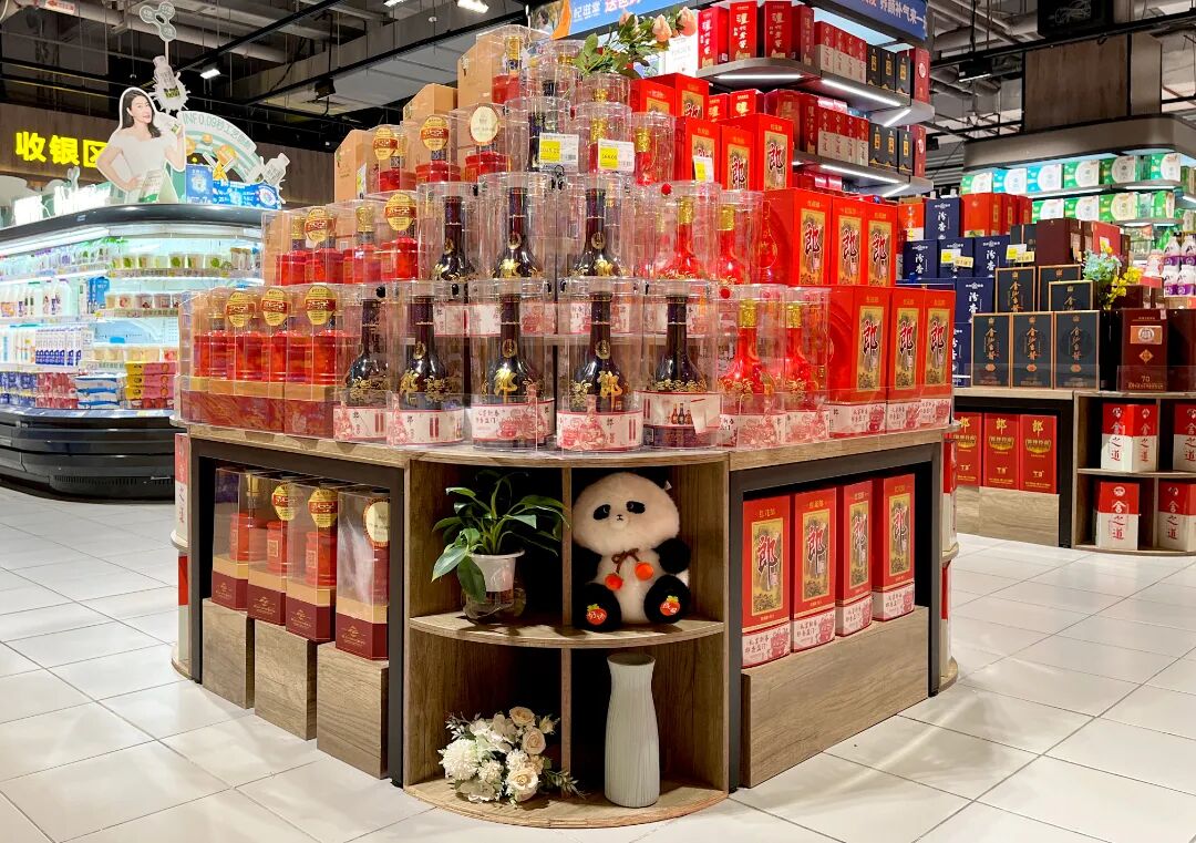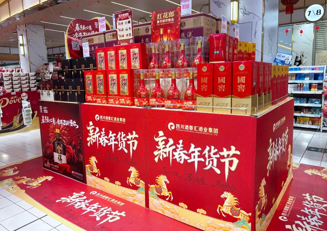 目前郎酒在集团合作的各大商超打造的春节堆头,不仅新年氛围浓厚,活动福利也非常给力,购买郎酒品牌产品,满额送好礼!
